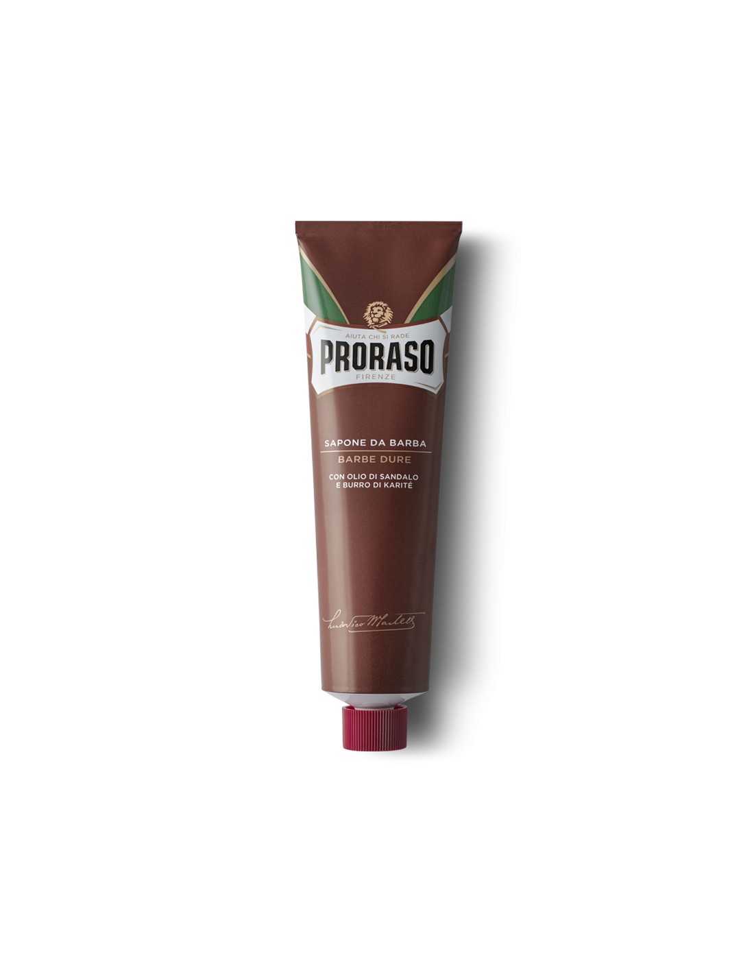 Jabón de Afeitar Barba Dura 150 ml Proraso. Muy fino, denso y cremoso, permite un afeitado preciso y protege la piel, dejándola suave e hidratada. Está fabricado mediante el proceso de saponificación con mezcla en caliente. Para obtener la correcta textura cremosa, la reacción continúa por una noche entera, durante la cual los ingredientes, aceites, ácidos grasos y álcalis, se mezclan y se funden entre ellos. El jabón se enfría gradualmente al mezclarse lentamente, perdiendo cualquier rastro de álcalis, agresivos para la piel. Depositado en contenedores de acero, después de 3-4 días alcanza la correcta estructura y estabilidad: resulta perfecto para respetar la piel e interactuar con la estructura de los pelos. Este proceso único hace que el jabón resulte más eficaz en la protección de la piel, facilitando el deslizamiento de la navaja.
