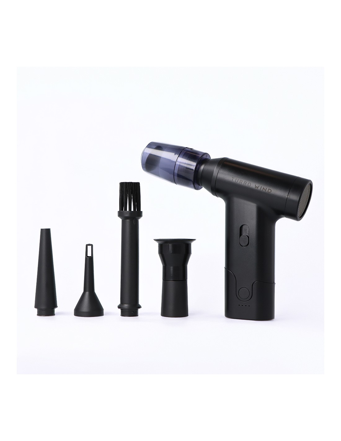 Velocidad máxima del aire: 110.000 RPM, Material de las aspas del ventilador: aleación de aluminio, Tipo de batería: ión de litio, Capacidad de la batería: 2000 MAH*2, Tiempo de carga: 3-4 h, Tipo de carga: USB tipo C, Fuente de alimentación: DC 5V, Adaptador de carga: 5 W / 2 A Tamaño del producto: 140 x 106 x 40 mm